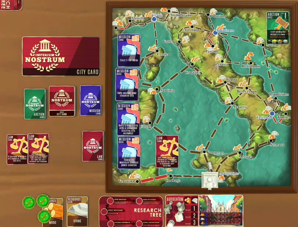 Imperium Nostrum is a resource management game set in the Roman Empire for 2 to 4 players. Players build and develop cities, expand territories, and aim to reach 50 victory points. Each player starts with a city, research tree, and resources. Mission cards, which offer 20 points upon completion, are drawn at the start, and auctions for powerful cards occur every few rounds. Players construct buildings to gather resources, upgrade cities, and unlock abilities like research, sabotage, and political power. Monuments and other achievements earn victory points, and the first player to reach 50 points wins.